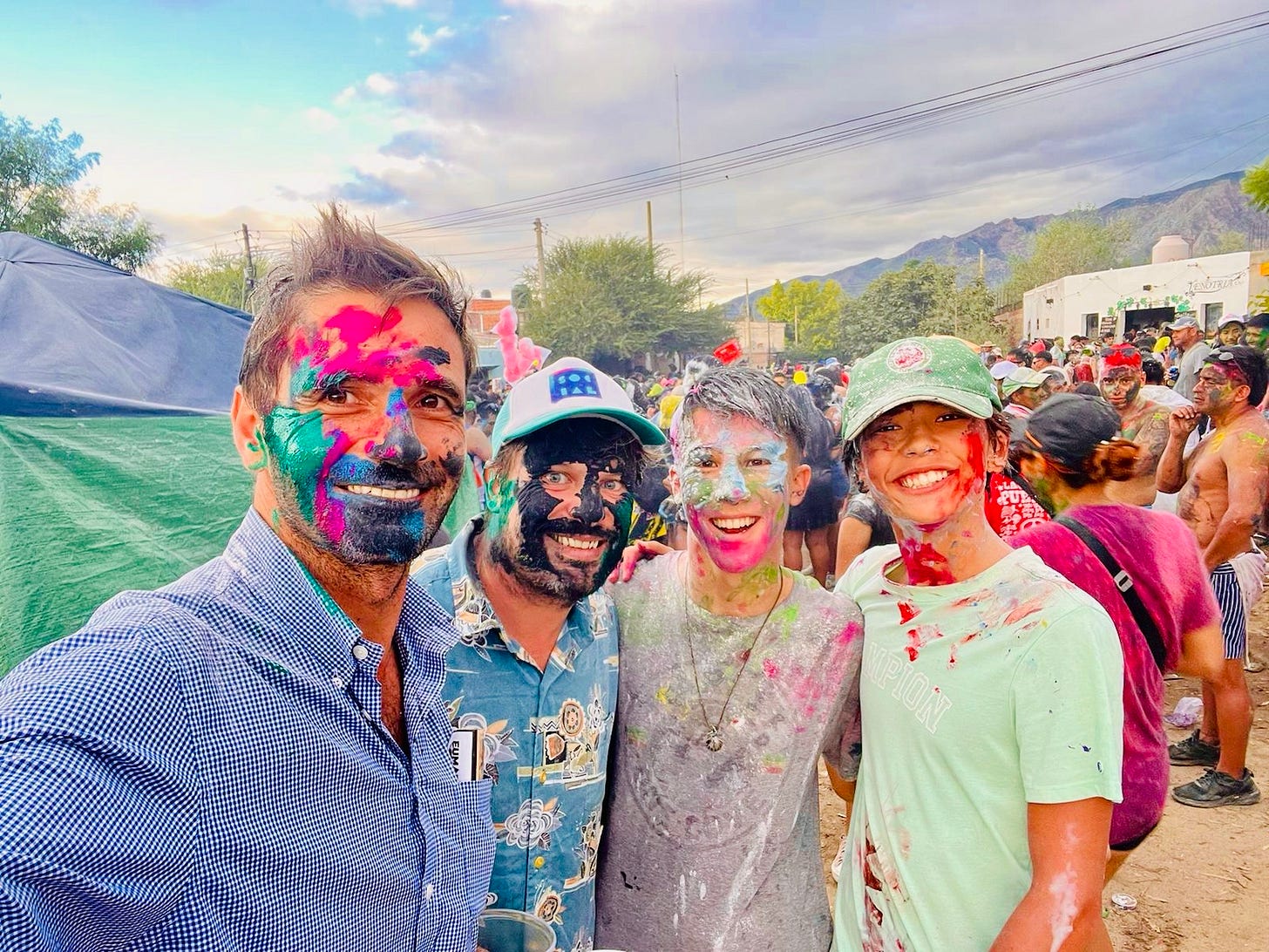 A couple of years ago we went to Cafayate during carnival weekend. Not on purpose, the event just happened to be going on when we went. We stay at a house in the center of town. I did not venture out but Adrien did. Here’s a photo he took of himself with our friend Tom Dyson and his kids.